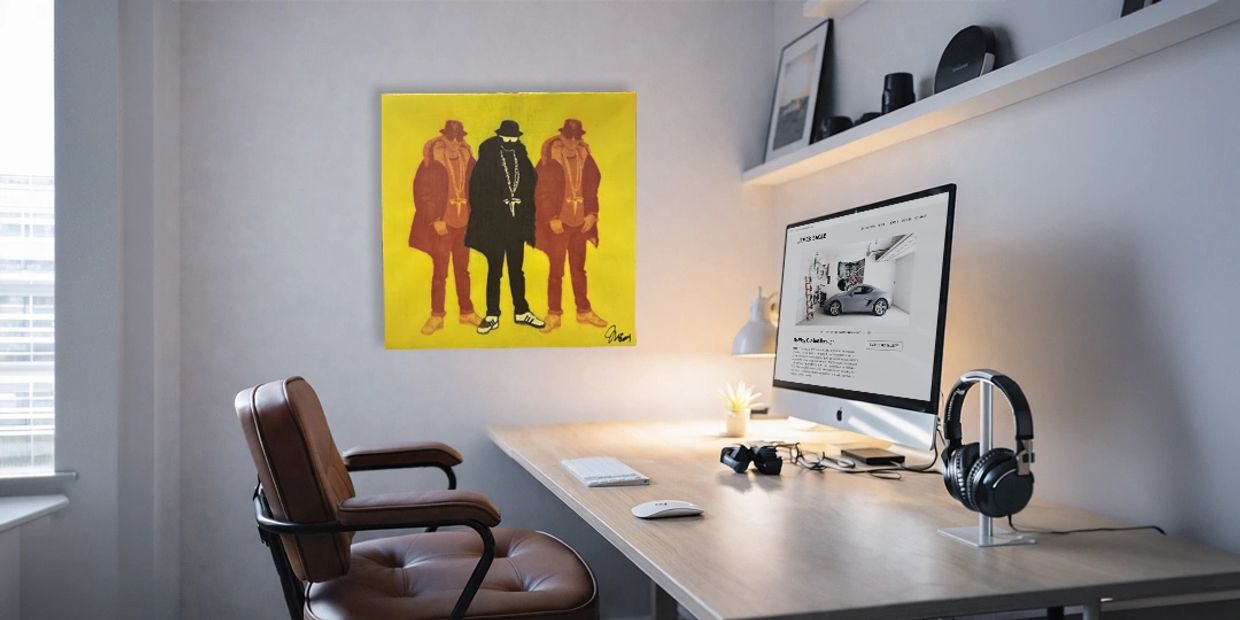 Mike D X 3 is a bold, graphic celebration of personality, influence, and playful identity. Created for a client who wanted to energize his home office, the piece brings together his love of the Beastie Boys, his own name—Mike D—and a moment of modern obsession after buying a Tesla. Using pop-art repetition, the work multiplies the subject three times, placing him in the iconic B-Boy look of Beastie Boys legend Michael Diamond. Built with cut paper and digitally reworked imagery, the piece is finished with a gold Tesla chain as a personal, tongue-in-cheek detail. Bright, confident, and unapologetically fun, the work turns fandom into personalization and a workspace into a statement.