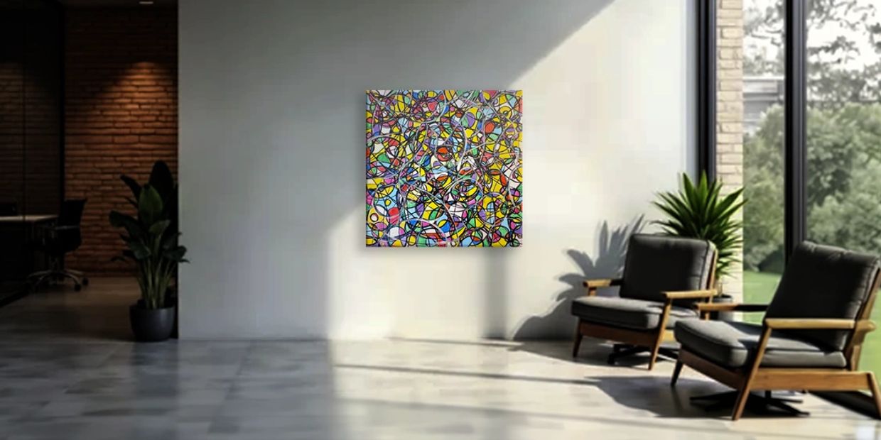 Quantum Symbolism came out of a fascination with quantum mechanics and the idea that multiple things can exist in multiple places at the same time. I kept layering shapes over and over—circles, fragments, colors—letting them collide, overlap, and reappear until the surface felt alive. Nothing fully disappears in this piece; it just shifts position, like thought, energy, or data moving through space. The repetition creates a kind of visual noise at first, but the longer you sit with it, the more it settles into something meditative. It’s chaotic but intentional, playful but dense—an abstract snapshot of how the mind processes complexity, where order and disorder exist at once.